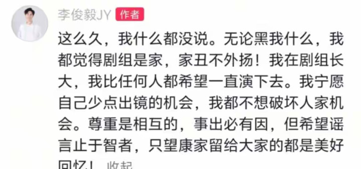 对于“康天庥”李俊毅而言,这种绑定从一份礼物逐渐变成一副重担。他几乎是康家第三代中唯一留下来的原版演员,这让他成了康家血脉延续在现实中的象征,也是观众情怀的最后寄托之一。然而,演员李俊毅有自己的现实人生。当他结婚,观众会不自觉地用“康家孙媳”的标准审视他的妻子;当他因个人原因无法拍摄某些戏份时,传言会立刻将之归结为“妻子吃醋”。角色吞噬了个体。